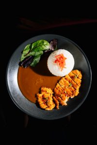 Golden, panko-fried katsu chicken, lettuce, Japanese mayo, takuan and curry sauce
