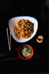 Japanese traditional fried rice dish. Garnished with spring onions and served with miso soup and Japanese pickle