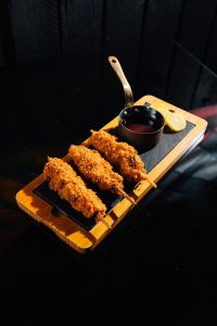 Crispy fried chicken tender in Teriyaki flavour with cucumber slices, Japanese mayo, and sesame seeds served in a soft hirata bun