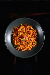 Soba noodles with chicken, carrots, pak choi, onion and beansprout in a choice of teriyaki sauce or chilli sauce.